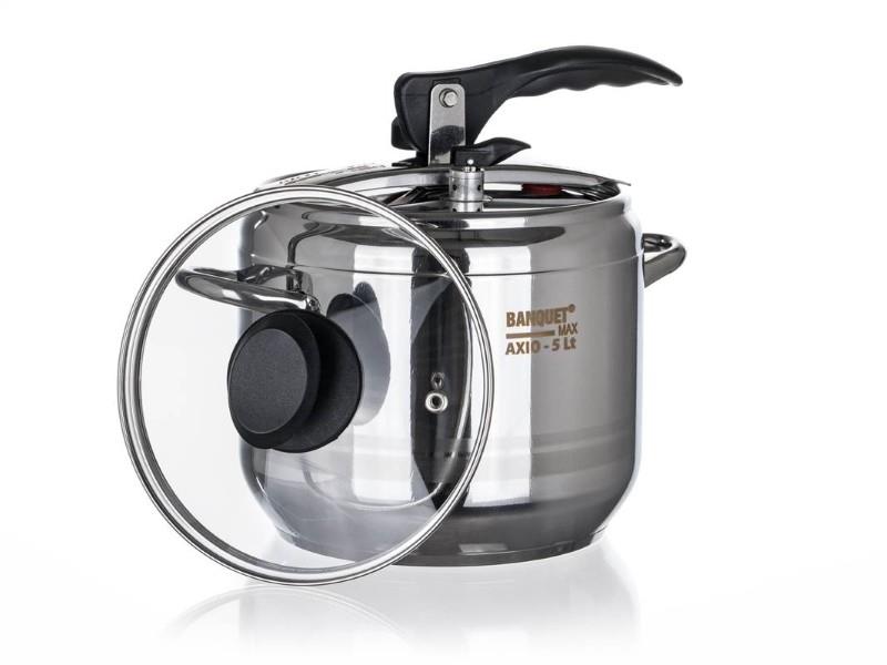 Nerezový tlakový hrniec 5 l s pákovým uzáverom a sklenenou pokrievkou, priemer 20 cm, nerezová oceľ 18/0, 3 ventily, hrubé sendvičové dno. Pokrievka obsahuje oproti predchádzajúcim modelom tri ventily, hlavný pracovný ventil, bezpečnostný ventil a silikónový ventil pod tlakovou svorkou na úplne bezpečné používanie. Pákový uzáver je zabezpečený proti náhodnému otvoreniu. Vďaka špeciálnemu tvaru a bezpečnostnému ventilu nie je možné tlakový hrniec počas varenia otvoriť. Tlakový hrniec je určený na rýchlu prípravu jedál a možno ho používať na všetkých typoch varných dosiek vrátane indukcie. Tlakový hrniec je vyrobený z hrubostennej celonerezovej ocele, má silné sendvičové dno a možno ho používať na všetkých typoch varných dosiek.