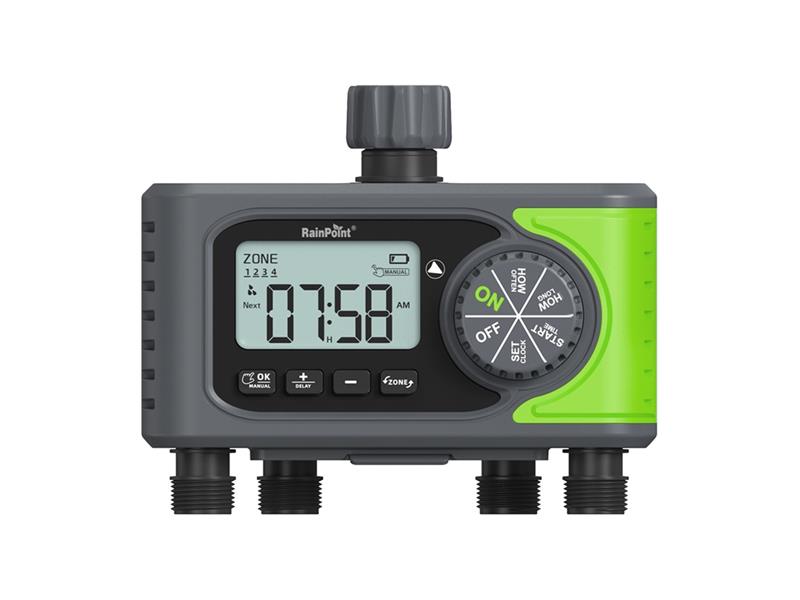 Riadiaca jednotka RainPoint ITV405 umožňuje spravovať štyri nezávislé zavlažovacie zóny z jediného kohútika. Každý výstup funguje ako samostatný časový spínač, čo vám umožní prispôsobiť plány rôznym typom vegetácie a oblastiam na záhrade. Ovládanie prebieha pomocou prehľadného LCD displeja (displej z tekutých kryštálov) a otočného ovládača, ktorý umožňuje ľahký prístup ku všetkým nastaveniam. Prístroj ponúka štyri samostatné ventily, ručné ovládanie a funkciu oneskorenia zavlažovania. Bude dobre fungovať s rôznymi zavlažovacími systémami, vrátane postrekovačov, kvapkačov alebo mikropostrekovačov.