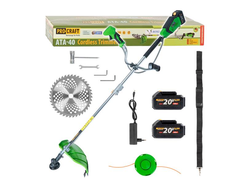 AKU krovinorez Procraft ATA-40 je určený na kosenie a vyžínanie trávnatých plôch, na odstránenie burín. Silný a tichý motor s otáčkami až 7000 zaručuje dlhú bezporuchovú prácu. Možnosť plynulej regulácie otáčok kosenia v závislosti na hustote a sile porastu a požiadavke na presnosť práce. Stroj je dodávaný v kartóne s 2 batériami 20V 4Ah, nabíjačkou, jednoramenným popruhom, strunovou hlavou, kovovým kotúčom, montážnym kľúčom. Balenie kartón.