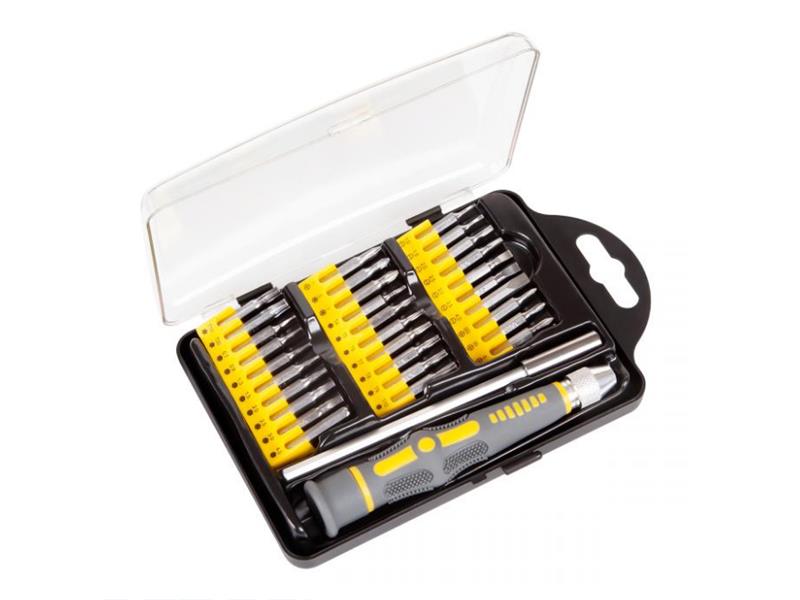 Vrátane bitov: • plochý: 1,0/1,5/2,0/2,5/3,0/3,5/4,0 mm • kríž PH: PH000 / PH00 / PH0 / PH1 • kríž PZ: PZ0 / PZ1 • Torx: T4/T5/T6/T7/T8/T9/T10/T15/T20 • Hex: 0,7/0,9/1,3/1,5/2,0/2,5/3,0/4,0 mm