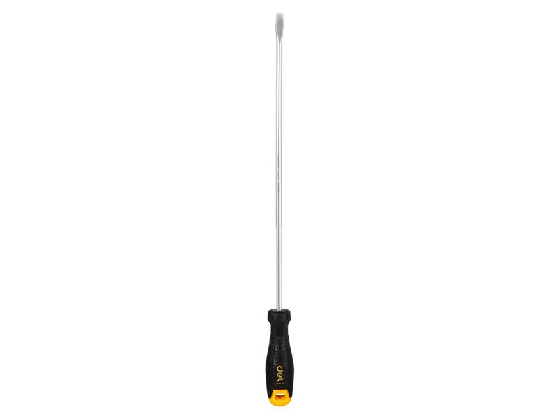 Praktický a odolný plochý skrutkovač v čiernej farbe. Rukoväť výrobku je vyrobená z vysoko kvalitného plastu. Je v nej praktický otvor, ktorý umožňuje zavesenie napríklad na dosku s náradím. Skrutkovač skvele padne do ruky a jeho používanie je mimoriadne pohodlné.