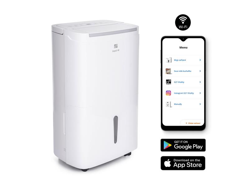 Odvlhčovač s kapacitou odvlhčovania až 40 l/24 h. Ovládanie cez WiFi s chytrou aplikáciou. Pre miestnosť 45 až 55 m2. Príkon 750 W, objem nádržky 7 l, tichá prevádzka. Dotykové ovládanie, chytré funkcie, automatické vypnutie pri naplnení nádržky. Odvlhčovač G21 Impact 40 s WiFi má kapacitu až 40 litrov za 24 hodín zaistí zdravú a príjemnú klímu s optimálnou vlhkosťou vzduchu aj vo vlhkých priestoroch. Oceníte ho pri vysúšaní po maľovaní, zabraňuje vzniku plesní v kúpeľniach a vlhkých miestnostiach, pomáha po zatopení priestorov dažďom alebo veľkou vodou. Príliš suchý vzduch človeku neprospieva, príliš vlhký vzduch človeku neprospieva. Aká je ideálna vlhkosť vzduchu v obytných miestnostiach alebo využívaných uzavretých priestoroch? Pokiaľ máte v byte alebo na pracovisku dlhodobo veľmi vlhký vzduch alebo ak potrebujete jednorazovo odvlhčiť vnútorný priestor (napríklad pivnica po zatopení spodnou vodou), bez kvalitného odvlhčovača sa nezaobídete. Odvlhčovač využijete, keď vlhkosť v byte alebo na pracovisku dlhodobo presahuje 65%, takže už neprospieva zdraviu. V lete je rozpätie 40 – 55 %, v zime potom 45 až 60 %. Odvlhčovač vzduchu G21 Impact 40 od českej značky G21 má kapacitu 40 l za 24 hodín. Je vybavený 7l, dostatočne veľkou nádržkou na kondenzát s priehľadným indikátorom stavu. Pozorovať ho však ani nemusíte – odvlhčovač sa pri naplnení nádržky sám vypne. Odvlhčovač používa ekologické chladivo R290, ktoré nepoškodzuje ozónovú vrstvu. Odvlhčovač pre domácnosti využijete pri odvlhčovaní plôch o veľkosti 45 až 55 m2. Vďaka premyslenému riešeniu ho môžete ľahko presúvať medzi miestnosťami a používať tam, kde je práve potrebné – večer vo vlhkej kúpeľni, ráno v izbe, kde sa suší prádlo, popoludní vo vlhkej pivnici. Odvlhčovač vzduchu sme vybavili nielen intuitívnym dotykovým ovládaním, ale aj WiFi. Ovládať ho tak môžete aj na diaľku – prostredníctvom inteligentnej aplikácie G21 Smart Home ho spustíte odkiaľkoľvek a kedykoľvek. Nechýba ani funkcia alarmu a automatického vypnutia pri naplnení nádržky s kondenzátom alebo časovač pre vlastné nastavenie času spustenia a doby odvlhčovania.