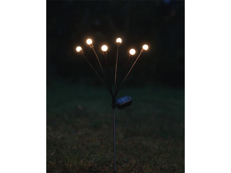 6 LED diód. Farba svetla: teplá biela (2700 K) Materiál: SS + plast IP: IP44 Solárny panel: polykryštalický kremík 2 V / 100 mA (veľkosť 55 × 45 mm) Napájanie: dobíjacia batéria 1× AA Ni-MH 1,2 V 300 mAh (súčasťou dodávky) Celková dĺžka: 70 cm Režimy osvetlenia: ON/OFF