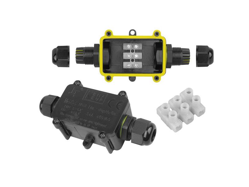 Typ zariadenia: inštalačná krabica Typ pripojenia: 3-koľajová lišta so skrutkovými svorkami Maximálny prúd: 24A Počet káblových vstupov: 2 Maximálne napätie: AC 450V Použitý prierez kábla: 0,5 - 2,5 mm2 Priemer kábla: 5 - 8 mm Stupeň ochrany: IP68 Rozmery: 42 x 37 x 28 mm
