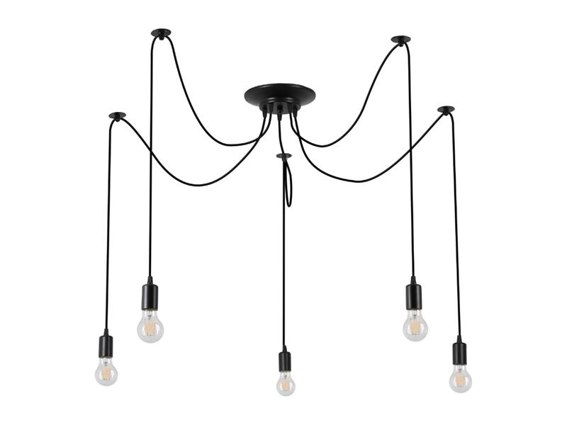 Svetelný zdroj: 5 x E27 (max. 35 W) - nie je súčasťou dodávky. Napájanie: AC 230 V Dĺžka kábla: 150 cm Rozmery základne: 120 x 120 mm Rozmery zásuvky: 38 x 38 x 60 mm Celkové rozmery: 3000 x 3000 x 1500 mm Stupeň ochrany: IP20 Materiál: oceľ Farba: čierna