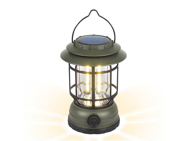 Funkčná kempingová lampa štylizovaná do klasických petrolejových lámp, napájaná vstavanou batériou a solárnym panelom. Možnosť zavesenia do stanu (vstavané madlo). Je to silný zdroj svetla vďaka použitiu LED diód. Má plynulé nastavenie jasu svetla. Vstavaný port USB umožňuje rýchle dobitie lampy v neprítomnosti slnečného svetla.