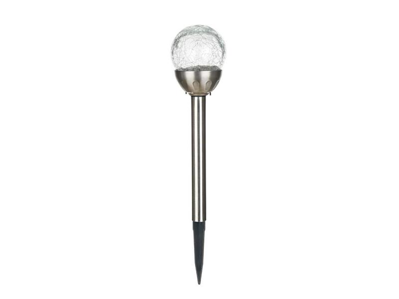 Solárna nerezová lampa - s výškou 38,5 cm a skleneným dekoračným tienidlom v tvare gule s pavučinovým dekorom s priemerom 8 cm, svetelný zdroj - 1 biela LED a 1x farebná LED. Pri prevádzke je možné prepínačom zvoliť režim svietenia buď stabilnej bielej farby, alebo meniace sa farebné spektrum. Solárna lampa je funkčná a zároveň dekoračná súčasť do každej záhradky. IP 44.