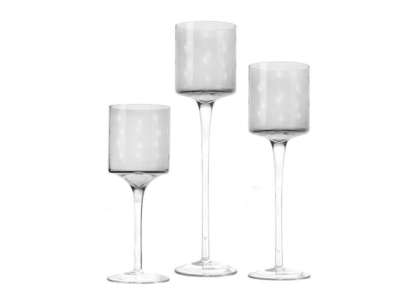 Sklenený svietnik na čajové sviečky je skvelou dekoráciou nielen v čase Vianoc. Môžete ho umiestniť do radu na stred stola alebo na poličku do trojuholníka alebo je možné rozmiestniť jednotlivé čaše rôzne po domácnosti. Čaše sú na vysokej nôžke a zdobené brúseným dekórom hviezdičiek. Sviečky by vo svietniku nemali horieť dlhšie ako 2 hodiny v kuse. Vhodné ako darček.