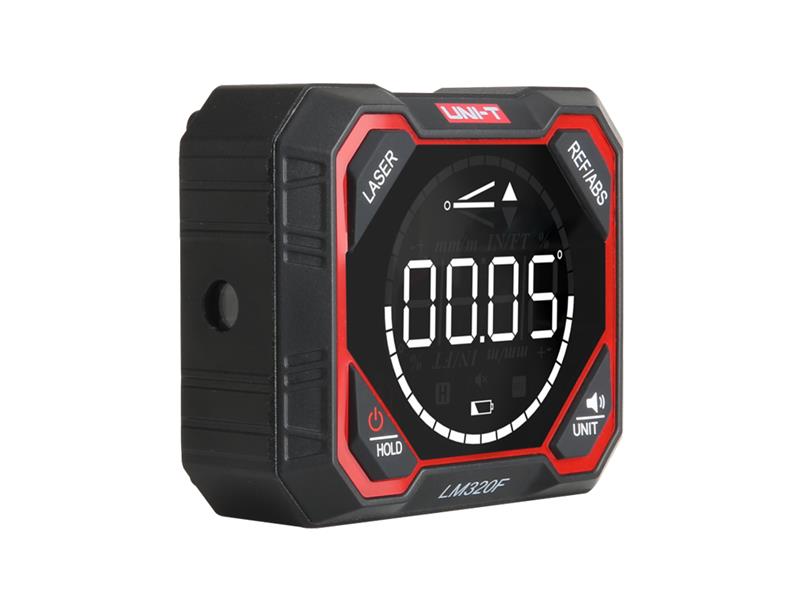 Digitálny uhlomer LM320F je ľahký a prenosný uhlomer s odolným rámom z hliníkovej zliatiny, čo je zárukou odolnosti pri práci. Umožňuje presne zmerať sklon roviny, nahradzuje vlastne vodováhu pre práce v stavebníctve - pri stavbe striech, podláh, kanalizácií. Je vybavený displejom s vysokým rozlíšením a automatickým otáčaním obrazovky, ktorý podporuje celý rozsah merania 4×90°. Zariadenie poskytuje údaje o uhle náklonu v reálnom čase a je vybavené magnetickou základňou pre ľahké a stabilné polohovanie. Základnou jednotkou merania je stupeň (°), je však možné zvoliť aj iné jednotky: percentá (%), milimetre na 1m dĺžky alebo palce na 1 stopu. Je široko používaný v oblasti strojárstva, stavebníctva a mechanických inštalácií. Prístroj má zabudované tri lasery, ktoré je možné jednotlivo zapínať a vypínať a ktoré môžu premietať stred uhlomeru napr. na stenu. Prístroj má zabudovaný lítiový akumulátor 3,7V, 1000mAh, ktorý sa nabíja v prístroji priloženým káblom USB-C.