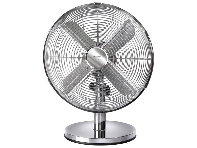 Kovový stolový ventilátor Priemer lopatiek 30 cm Vysoko kvalitné pochrómované prevedenie Unikátny dizajn lopatiek pre tichý chod a maximálny výkon Predné a zadné kovová ochranná mriežka 3 rýchlosti Automatická horizontálna rotácia v uhle 90° s možnosťou vypnutia Nastaviteľný uhol sklonu Ochrana proti prehriatiu Otočný spínač na kryte motora Pogumovaná spodná časť ventilátora zabezpečujúce vysokú stabilitu Príkon: 35 W